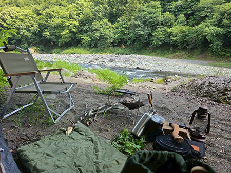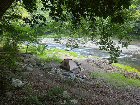 川沿いなので、キャンプスペース自体は、それほど広くありませんが、川沿いを独り占めした気分になることでしょう。焚き火の揺らぎを眺めながら、テント泊、タープ泊するには最高のロケーションだと思います。目の前に流れる川自体は、それほど深くないので対岸まで歩いて渡っていくこともできます。仲間で行くなら、対岸に設営することも出来るかもしれません。