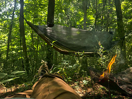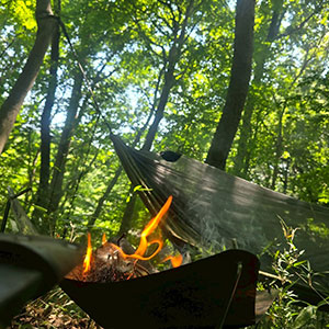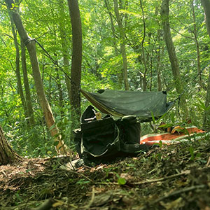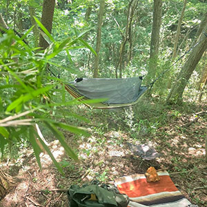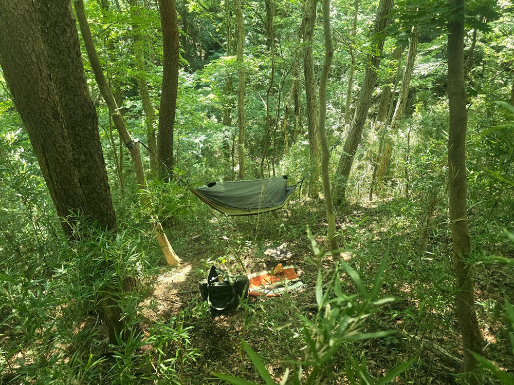 おすすめのキャンプギアにつきましては、とにかく少なく、軽くと言うことをおすすめします。サバイバルキャンプを楽しんでいただくのが醍醐味かも知れませんね。これは必須です。ハンモックやはりハンモック限定サイトでもありますので絶対ですね。それに、ひとつありました!小さな折り畳みのスコップ必須です。軽い傾斜ですが、地面は比較的柔らかいので掘っていただいて水平の場所を作っていただければ。さながら、海外動画張りの野営をしていただくのがいいかも知れませんね…さらにミリタリーレーションなんかを買って持っていってみるのもいいかも・・・。