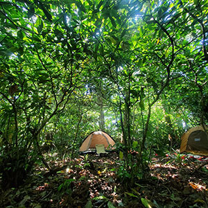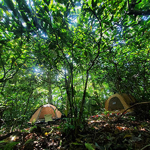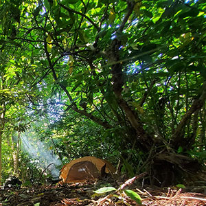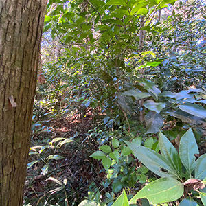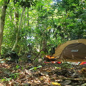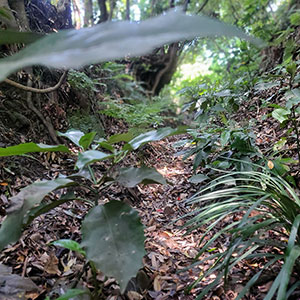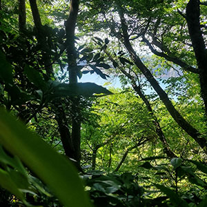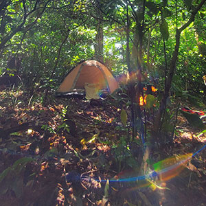 【逗子桜山キャンプサイト】は、逗子芦花公園から続くハイキングコースを進んだほぼ突き当りにあります。ハイキングコースの山道を20分くらい進むと、小高い山の上に出ます。きっと誰も来ないであろう静かな場所があります。ハイキングコースの一番奥にはかつての展望茶屋の古屋がありますが、すでに廃業していて面影だけがたたずんでいます。このエリアは、かつての展望スポットだけあって、湘南の海のきらめきや夕焼けに包まれた富士山が望めます。しっとり落ち着いた森の中で降り注ぐ木漏れ日に酔いしれることができる素敵な場所です。ハイキングコースの徒歩の道のりは人がひとり歩ける道幅の山道ですが、海や江ノ島を横目に見ながらのんびりと歩くにはちょうど良い距離感です。今はあまり使われていないためか、ブッシュに覆われそうになっている場所や倒木が横たわっている箇所もありますが、そんな自然のままの姿がキャンプ気分を余計に盛り上げてくれます。 |