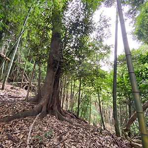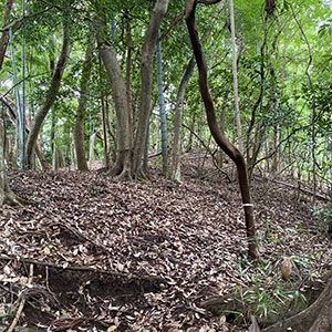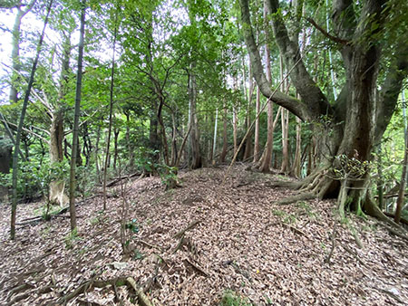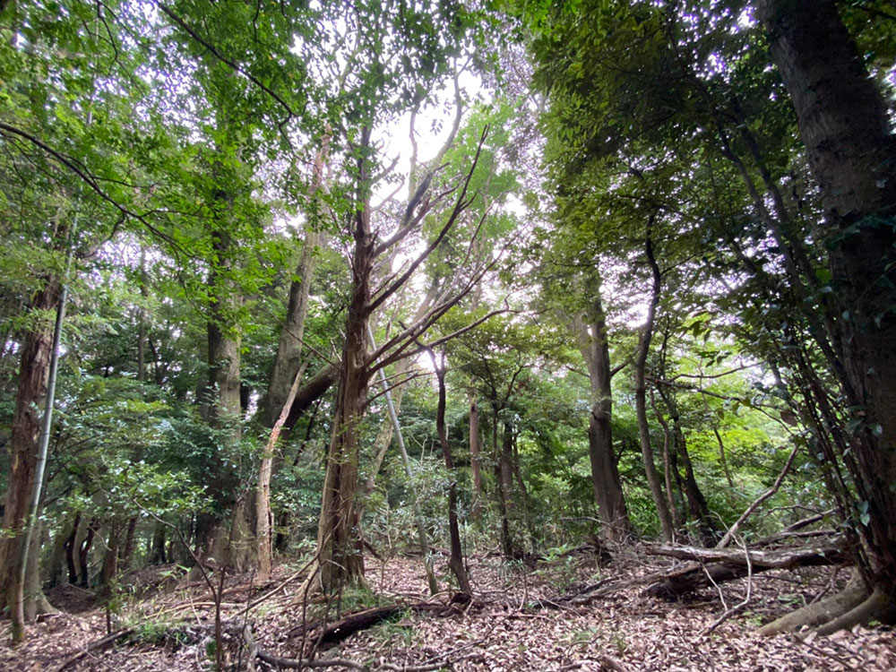 【小田原入生田キャンプサイトNo,2】は、小田原市入生田エリアにある森のキャンプサイト。あちらこちらに倒木が横たわり、本格的なブッシュクラフトが楽しめる場所です。広大な森の一角ですが、鳥のさえずりが森のあちらこちらから聞こえてきます。このキャンプサイトには、車で乗り入れることができるのが特徴で、4輪駆動車ならキャンプサイト内に車を停めて車中泊も可能です。森の入口付近には、曲がりくねったワインディングを超えていく必要があるので、2輪駆動車の場合は入り口付近に車を停めることになるでしょう。それでも、歩く距離は数十メートル程度ですから、何も問題はありません。とにかく、たどり着く先に広がるのは、平坦で使いやすい本格的なキャンプフィールドです。山頂付近に広がるこのキャンプサイトは、とにかく静かで人工的な音は一切ありません。地図で見ると、緩やかに盛り上がった山の頂ですが、そこにフィールドがフラットに広がっています。森は果てしなく続いていますが、向こうには竹やぶがあって、その向こうにはさまざまな雑木が彩を添えています。木々の間からは、遠くにかすんだ山々も見えます。江戸時代、いやそれ以前から、この景色は何も変わっていないのだろうと、時が止まったような感覚さえ感じることができます。昔ながらの日本の野山がそこにあります。森の先には、木々の間から遠くにかすんだ中に山々が見えて、ここが静かな山中であることを改めて教えてくれるます。このキャンプサイトは、いつまでもそこで過ごしたいと思わせるほど居心地が良いのが特徴です。もちろん、車でなくても、電車でもアクセス可能です。入生田駅から徒歩でここまでたどり着くことができます。入生田エリアの散策を兼ねてぶらぶらして、ちょっとしたハイキング感覚でここまでお越しください。ここなら、どんなキャンプスタイルも可能です。フラットな場所には大き目のテントも張れますし、ハンモックテントも木々があるのでセットできます。スペースも広いので、グループで遊びに来ても、それぞれがある程度の距離感を保ちながら、ソロキャンプのように独立してテントを設営することができます。真ん中あたりに焚き火台を設置して、ここを憩いの場として使えば、楽しいと思います。 |
