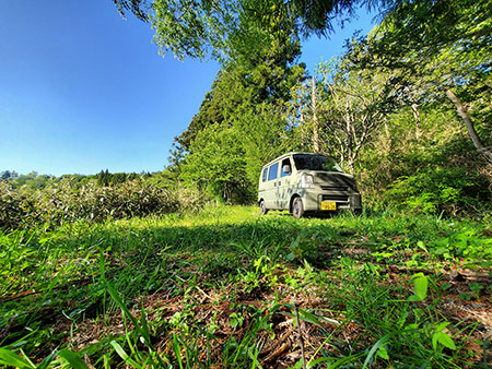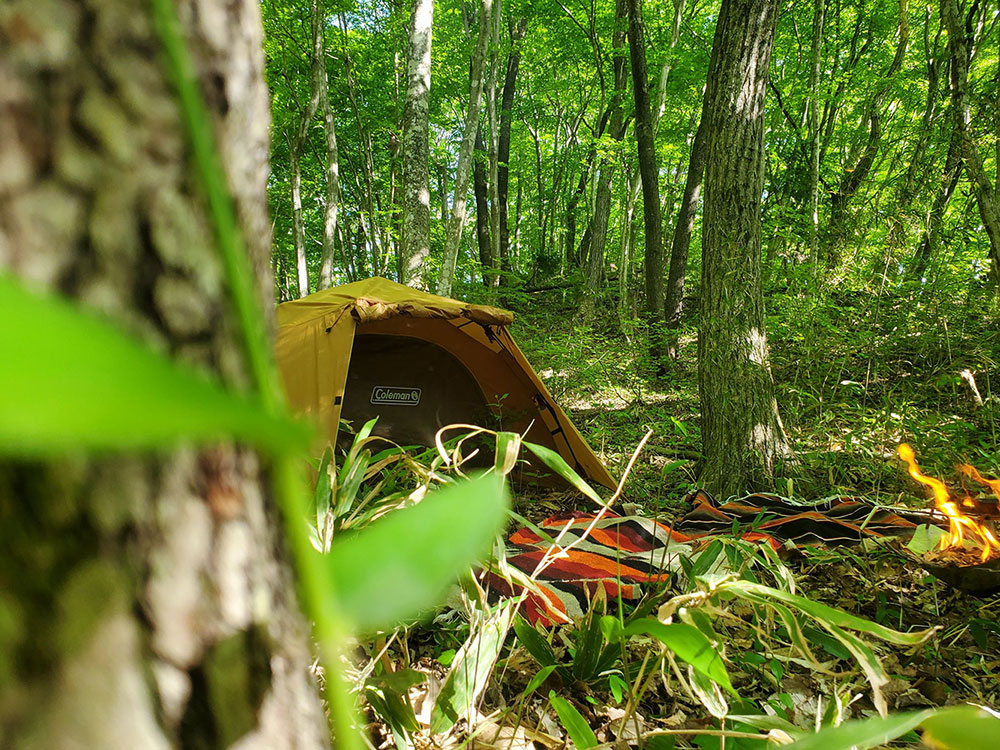 【西郷村鶴生キャンプサイト】は、「畑が広がる中にこんもり見える山」といった感じの場所です。やさしい日差しの入る自然林で、小川も流れています。とてもなだらかな山全体がキャンプサイトになっており、キャンプサイトの西側には「千歳川」が流れています。「風水」では西側の川は金運をもたらすもの」とされています。ひょっとしたら、ここで過ごすことで金運アップできるかもしれません。サイトは西郷村の鶴生松葉という場所にあります。西郷村に伝わる言い伝えの中に、鶴が生まれて元気になったという話が残っていますが、その話が「鶴生」という地名の元になっているそうです。穏やかな雰囲気の山というか森で、サイト内に源泉水場もあります。なだらかな起伏のある土地形状ですから、好きな場所を選んで自由にセッティングすることができます。森の中に高低差があるため、見晴らしの良い場所があったり、落ち着く場所があったりします。行ってみてのお楽しみとなりますが、リピーターが多いのも納得できます。四季折々の自然が豊かなこの場所は、スタッフも一押しのキャンプサイトです。