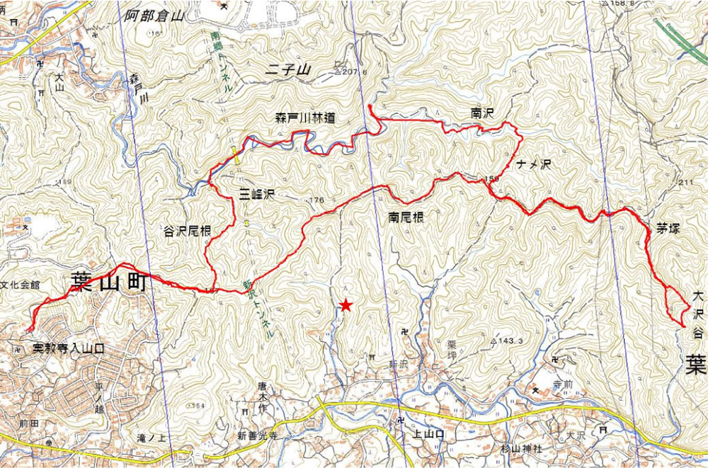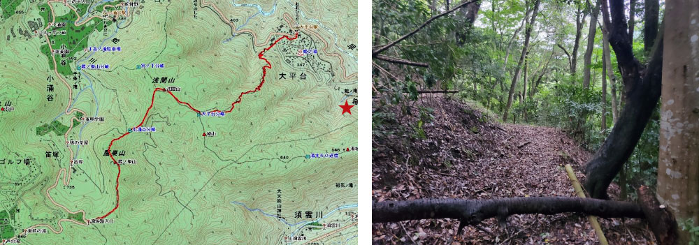 【葉山上山口キャンプサイト】は、三浦アルプスハイキングのメインルートにつながっています。アップダウンは大きいながらも、特に危険な個所はありません。大桜周辺のピークには勾配の急な上り下りが多いので注意が必要です。その中でも、大桜東側は大雨の後巨大な滑り台と化し、ロープに頼らないと上り下りができないこともあります。仙元山と戸根山の間にはジェットコースターと称される約200段の登り下りの急傾斜階段があるので、休憩スポットは、観音塚、大桜、東電3・4号線No.34鉄塔がおすすめ。陽当たり、見晴し共によしの場所です。そして、なんと言っても、乳頭山からの見晴しは最高です。写真の「赤い星マーク」が【葉山上山口キャンプサイト】の場所です。