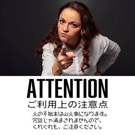 最も危険なのは、山火事問題です。ちょっとした不注意から大きな山火事につながることがあります。焚き火や使用した炭による火の不始末は山火事の原因となりますのでNGとさせていただいております。炭は粉になるまで細かくするか、燃えカス炭はお持ち帰りください。特に炭は消えたと思っても、水をかけると煙が発生する場合があります。静まっているように見えても燃えやすいものがあると、そこから引火して山火事につながる恐れがあります。枯れ草等のある火災が起こりやすい場所では、たき火をしないこと。たき火等・・・・・